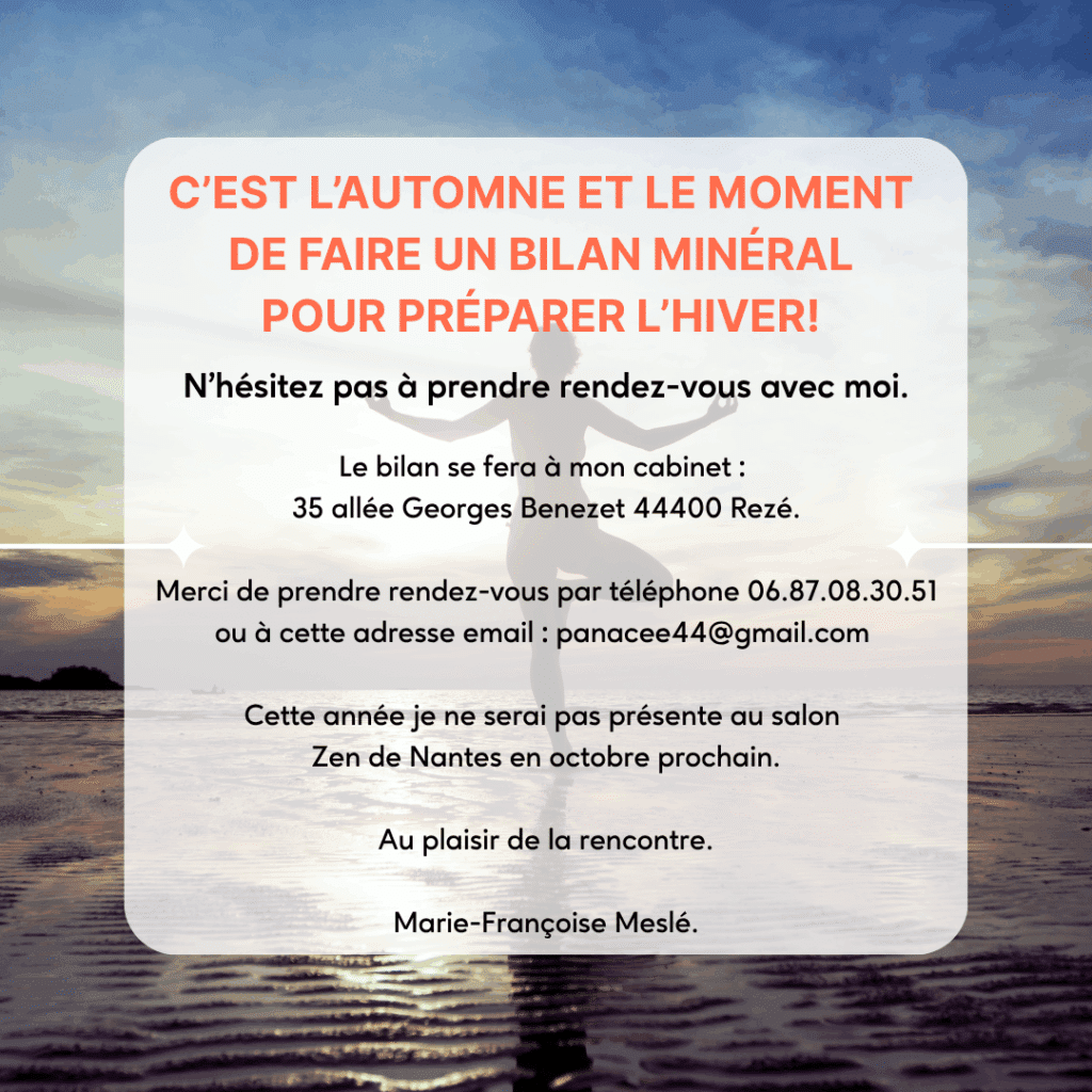 Pour vous apporter le meilleur, votre thérapeute vous propose des séances d’éducation et formation à la santé et de TNC. Pour réaliser un régime alimentaire optimal, elle effectue le bilan Oligoscan. Il s’agit d’un bilan nutritionnel sans prise de sang.